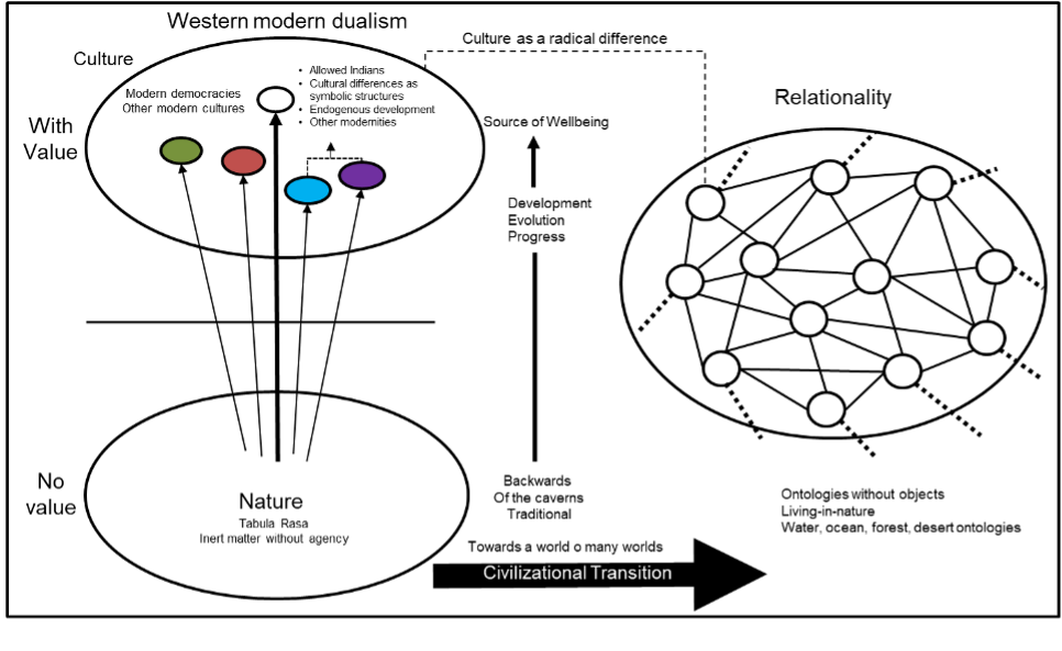 While the modern way of life acknowledges cultural diversity, it homogenizes cultures, erasing the radical identity differences that, for instance, challenge the culture-nature hierarchical division. As can be seen in Fig. 1., within the sphere of Culture (with uppercase) other cultures (lowercase) are included, integrated by the modern way of life. From the perspective of cultural differences as symbolic structures in anthropology, all cultures worldwide have undergone hybridization processes, meaning that, in one way or another, all cultures have already modernized.