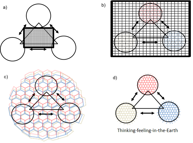 Figure 2. a) Instrumentalist rationality, b) Decentralized instrumentalist rationality, c) Communicative rationality, d) Environmental rationalities (dialogue of knowledge / Thinking-feeling-in-the-Earth). Note: The spheres symbolize the territories, while the triangle in the center alludes to the cognitive connection achieved through dialogue.