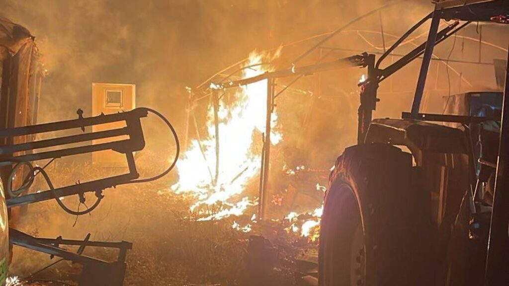 A Palestinian farm burns after a settler raid and arson attack. Credit: ISM