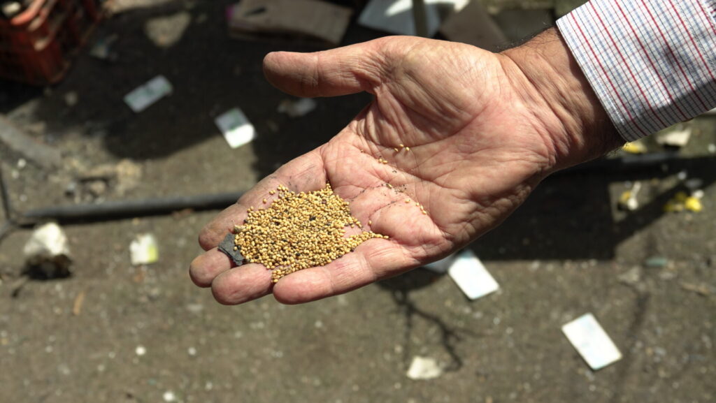 A Palestinian farmer saves seeds after a Zionist attack. Credit: ISM