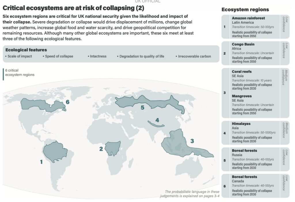 A summary, first: The Assessment’s central claim is that ‘biodiversity loss impacts national security’, heightening risks of mass migration, resource competition and geopolitical instability. More specifically, the Assessment argues that current rates of biodiversity loss mean that the world’s ‘critical ecosystems’ are all ‘on a pathway to collapse’. The report deems six ecosystems particularly critical for UK national security – the Amazon rainforest, the Congo basin, the coral reefs and mangroves of South East Asia, the Himalayas, and the boreal forests of Russia and China – and sees a ‘realistic possibility’ that some of these will collapse from 2030. The report identifies various ways in which the collapse of these ecosystems might impact UK national security, but is particularly concerned with risks to UK food imports, as well as from mass inward migration.
